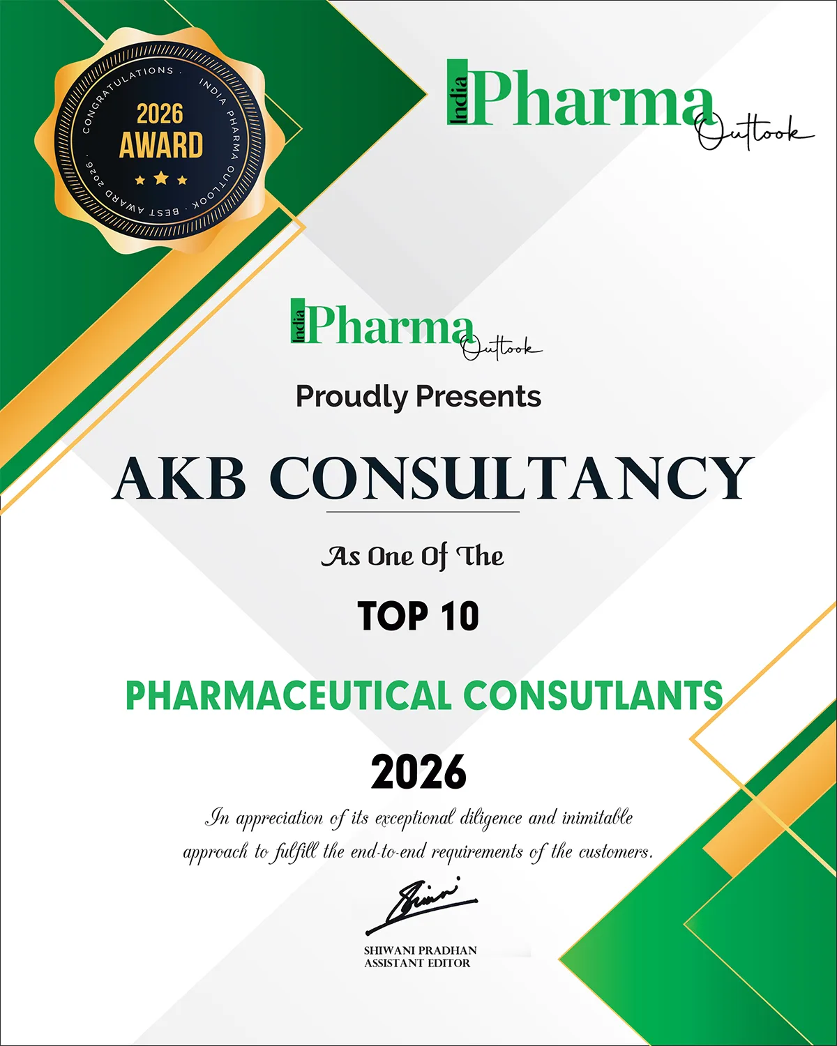 AKB Consultancy is proud to be featured and certified by India Pharma Outlook Magazine, one of the most respected publications in the pharmaceutical sector. India Pharma Outlook is widely recognised as a credible and authoritative source of industrial insight, trends, and strategic analysis across the pharmaceutical landscape — from drug discovery and APIs to biologics and regulatory developments.